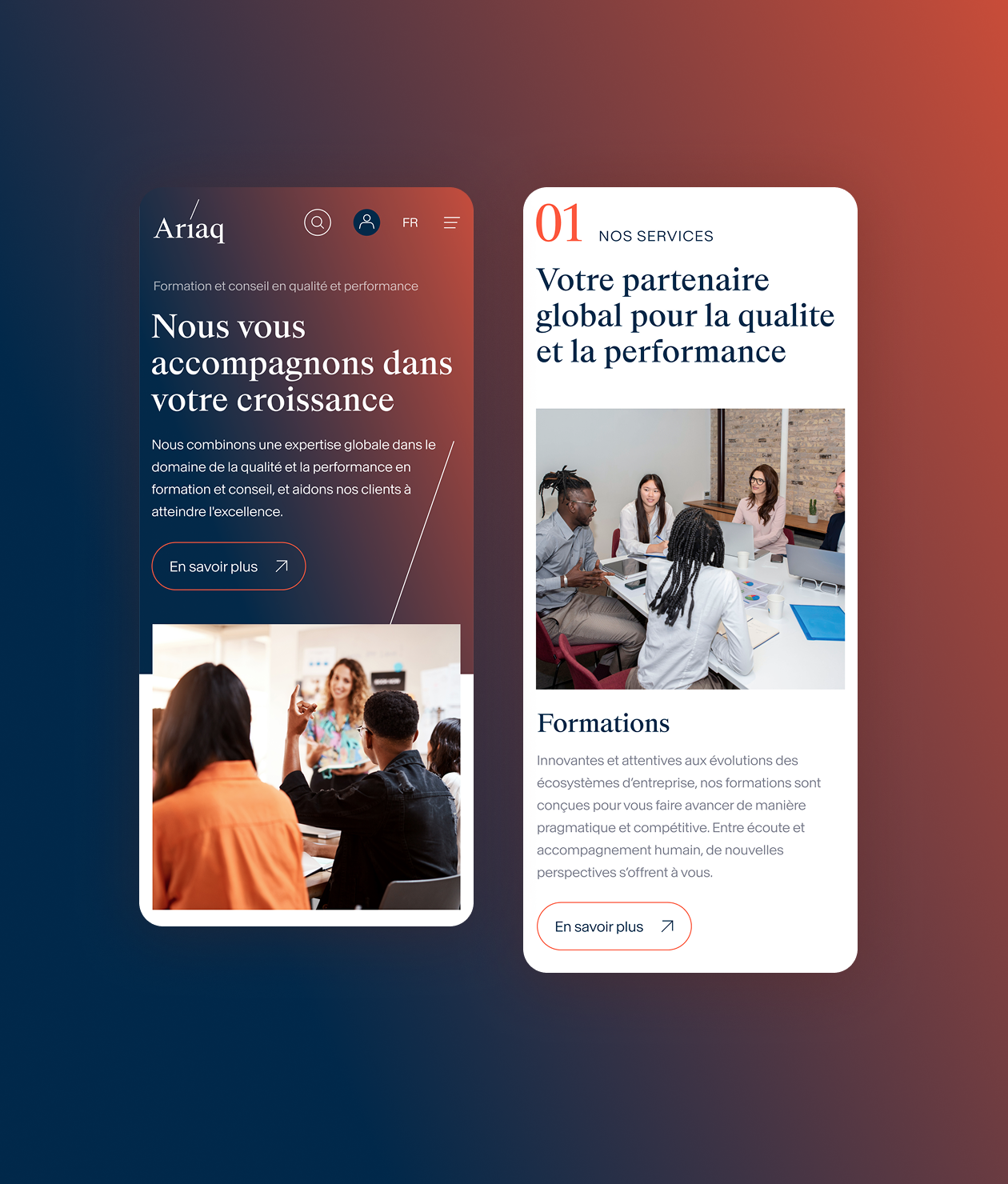Un repositionnement global de la marque a été réalisé, mené en partenariat avec Hymn, en charge de la nouvelle identité de marque d’ARIAQ. Sur cette base, Sinartis a assuré la traduction de cette identité dans l’expérience digitale, en veillant à une cohérence totale entre positionnement, parcours et usages.